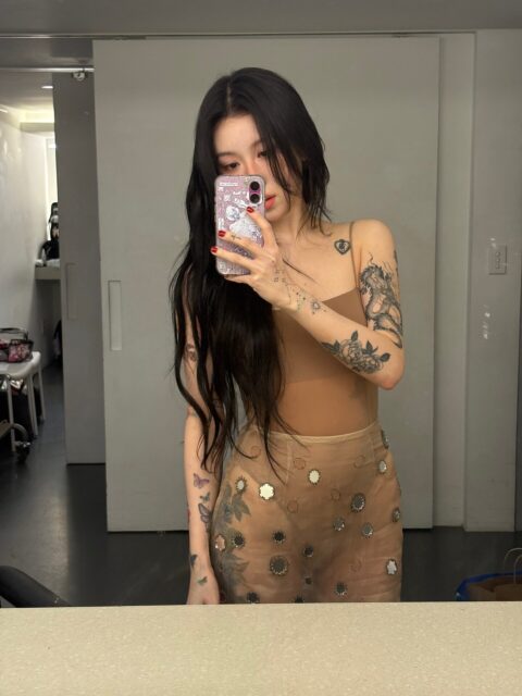 ペク・イェリンは最近、自身のInstagramアカウントに新しい写真を複数アップロードしました。その中でもあるショットでは、リラックスしたスタイルの服装で部分的に太ももが露出しており、その箇所に大きなタトゥーが描かれているのが確認できます。