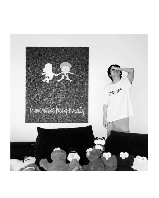 Vがシェアした投稿の中には、韓国のアーティスト、ウ・ククウォン氏による「Lunatic Beauty」という作品の横に立つVの写真が含まれていました。この作品は、赤い花々の中で裸の人間と犬が共に横たわっているというもので、「無邪気さとは狂気の一種である」というフレーズが添えられています。